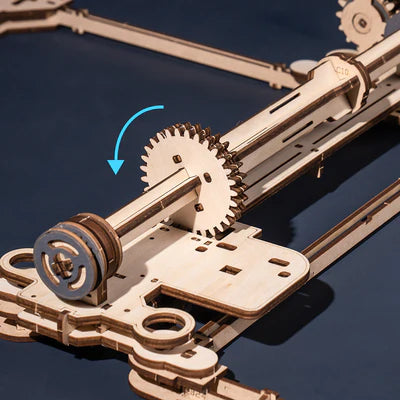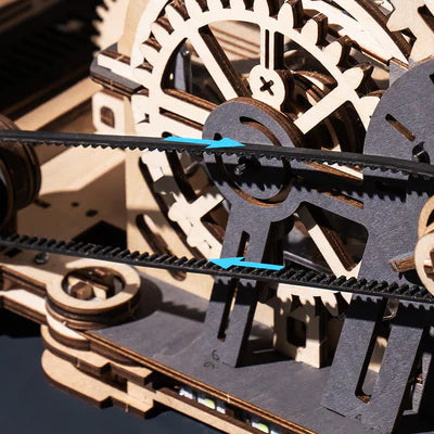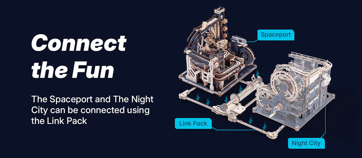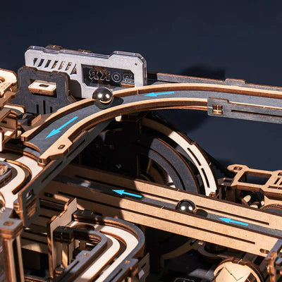 Transparent acceleration spiral and vertical stairs transport the ball through the track